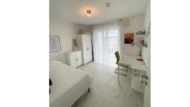 Das moderne und hell geflieste Duschbad verfügt über eine große Dusche, ein WC, ein Waschbecken und einen großen Badspiegel.