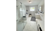 Das exklusive Badezimmer mit Fußbodenheizung verfügt über eine große Badewanne, eine große begehbare Dusche, einen schönen großen Waschtisch, einen modernen Spiegelschrank, einen Handtuchheizkörper, ein WC und über Anschlussmöglichkeiten für Waschmaschine und Trockner. Ein großes Fenster sorgt auch hier für perfekte Lichtverhältnisse.